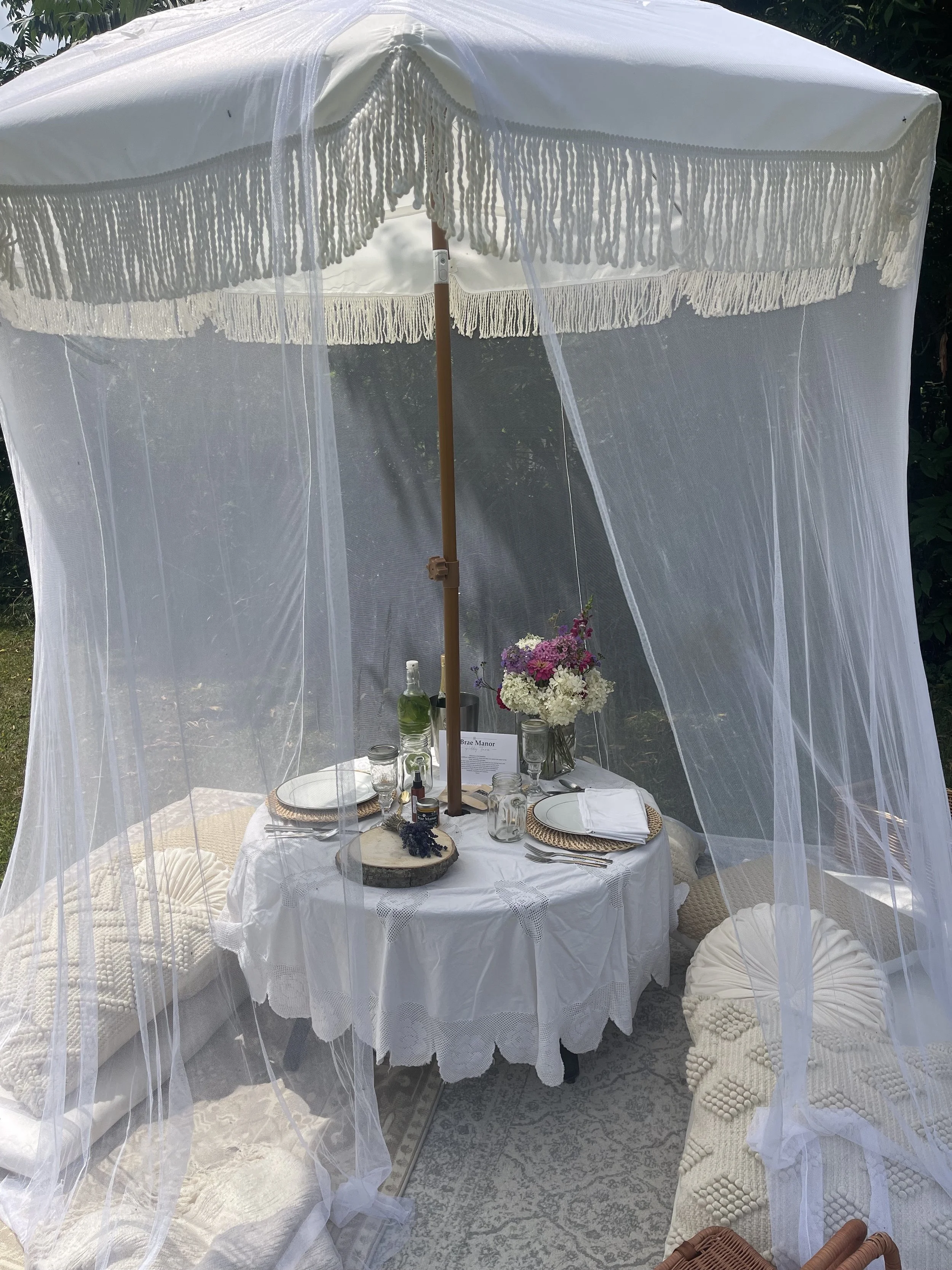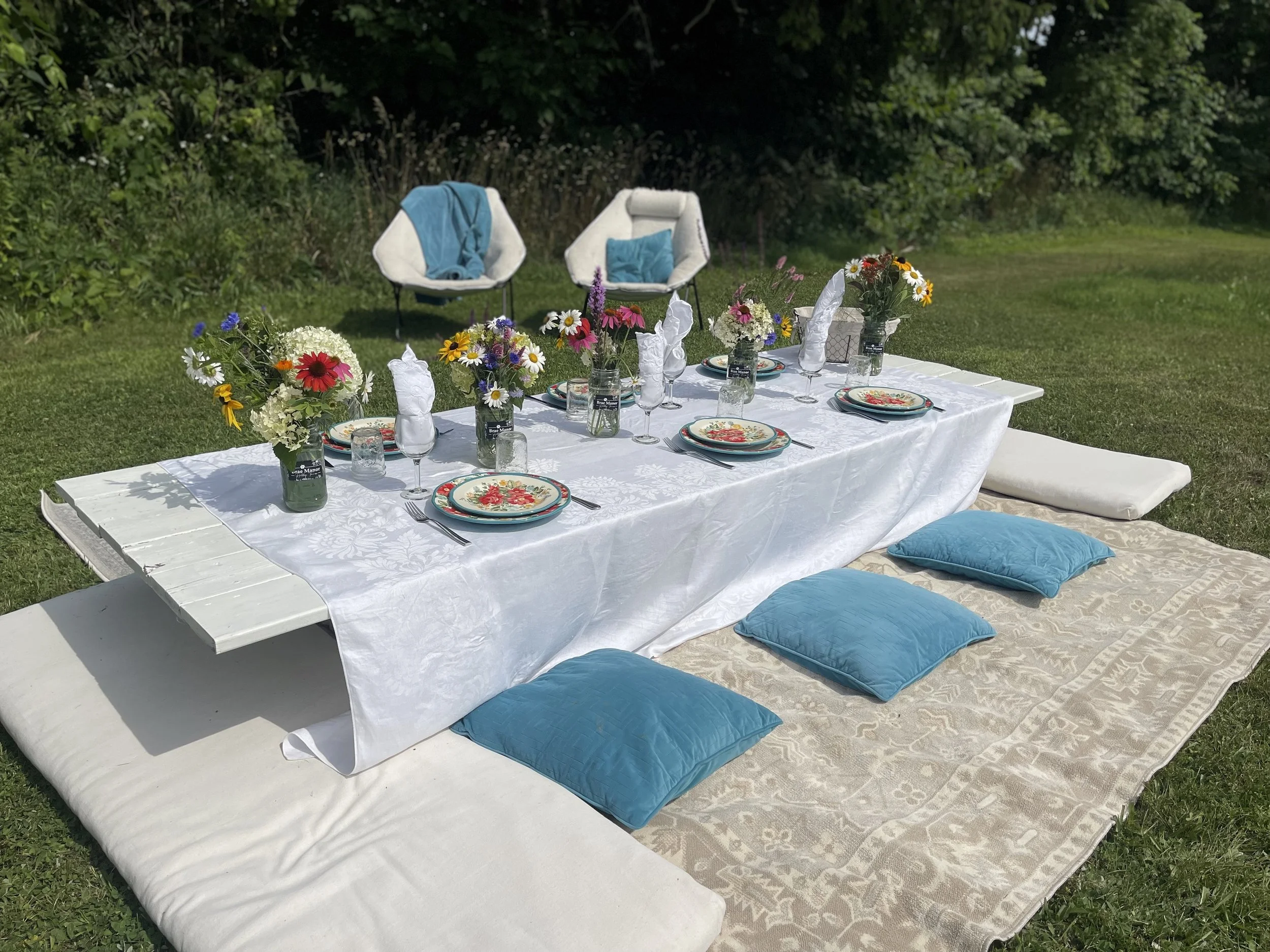 Complete setup and cleanup of Boho Experience including table, rugs, umbrella, dishes, cutlery, pillows.